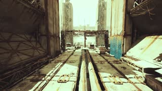 Rusty cargo area illuminated by warm backlight with silhouettes approaching