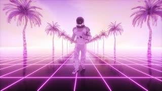1980s retro country drive seamless loop with vintage car. Stylized rural landscape in outrun VJ style, night sky and a city. Vaporwave 3D animation background for music video, DJ set, clubs, EDM music