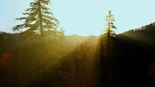 Calm natural border filled with towering pines and gentle light patterns