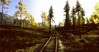 Scenic forest with glowing light, Serene train route amidst fall trees