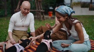 Asian Women Friends Playing with Dogs During a Park Picnic