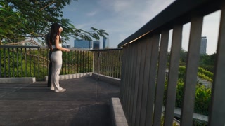 Asian Woman and Longhaired Man Practice a TikTok Dance on a Wooden Platform Overlooking Greenery and