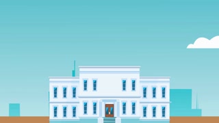 City bank building with people and urban traffic 2D cartoon animation. Busy cityscape with financial district, pedestrians and cars animated flat characters 4K video background scene storytelling