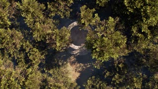 Top-down aerial view flying along a winding dirt path through a dense, sunny forest leading to an ancient, mysterious stone water well