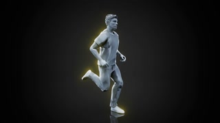 Close up follow shot of man running to the horizon seamless loop. Stylized male silhouette on a deserted empty mountain road. 3D animation for 80s music video VJ. Reaching goals and motion concept. 4k