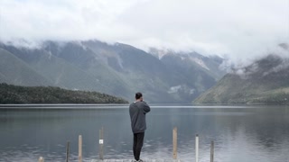 Young Woman in Hat Films Lake and Mountains in Spain with Phone Slomo
