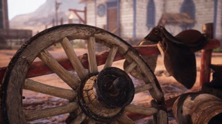 3D animation of a western ghost town on a sunny day, including several old west artifacts and church