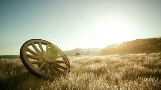 Old wooden wagon with a white cover in a rustic western town setting