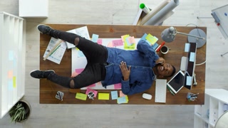 Top view of carefree black man lying on messy office desk and having telephone conversation with friend
