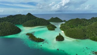 Aerial view of scattered islands with blue ocean water at Wajag Island, Raja Ampat, West Papua, Indonesia.