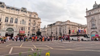 London, England - May 12, 2025: Busy street with red buses, pedestrians at a bus stop, and traditional city buildings. Vertical