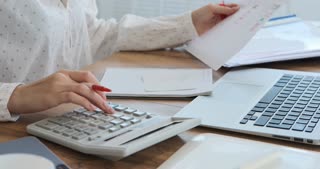 Close up shot of Woman checking bills, taxes, bank account balance and calculating expenses in the living room at home or office. Close up