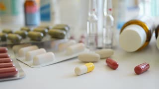 Medications pills and drugs in pot close-up macro. Pills and drugs pharmaceutical Industry. Vitamins. Medicine concept