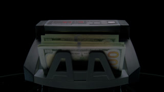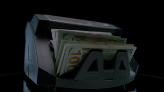 Slow motion shot of money counting machine for paper money. One hundred usd dollar bills calculation, currency exchange. Backlight, black