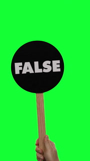 A hand waving a large black and white FALSE paddle in protest. Green screen. Vertical orientation for social media use.