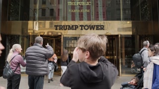 New York, USA - May 3, 2024: Front view of Trump Tower on 5th avenue with people walking past