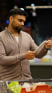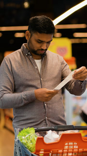 Indian man checking grocery receipt in supermarket