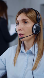 Focused female customer support agent working at desktop computer with headset microphone, assisting clients through online communication in
