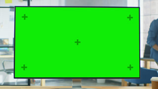 Wide Green Mock-up Screen Desktop Computer Standing on the Desk in the Modern Creative Office. In the Background Bright Creative Loft for Developers and Designers where Professional Working. Zoom Out