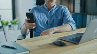 Entrepreneur Sitting at His Desk Works on Desktop Computer in the Stylish Office, Checks His Smartphone, Social Media App, email Business Associates, Messages