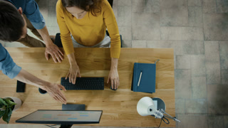 Top View Camera Shot: Female Office Worker Uses Desktop Computer, Project Manager Stands Beside and gives Advice on Optimizing Workflow for Customer Experience Management. Gradually Unfocusing Picture
