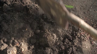 Close up of a shovel digging the soil in an allotment. Planting vegetable