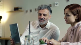 Colleagues talk about important project at table in office