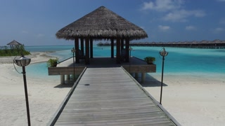 Aerial view of a wooden structure stands over the turquoise waters connected by a bridge to a white sandy beach, Eydhafushi, Baa Atoll, Maldives.