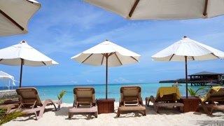 travel, tourism, vacation and summer holidays concept - patio or terrace with canopy on maldives beach sea shore