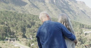 Happy middle aged caucasian couple talking and embracing on terrace in mountains, slow motion