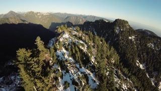 Rocky Mountain peak covered in Snow. Sunny Sunset. Aerial. British Columbia, Canada.