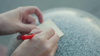 Note on stone. Fingers hold pen writing on textured stone. Quick note written with red pen on rough granite surface. Closeup of hand