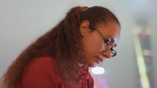 Young woman studying in soft light, red hoodie and glasses, close profile and frontal shots showing focused expression, gentle bokeh city