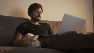 Man working on a laptop at home while sitting on the couch and petting a cat