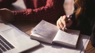Close up of woman hand taking notes in puzzle notebook during a meeting