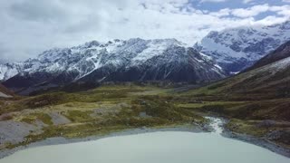 Aerial shot of shallow stream flowing out of glacial lake and running through green valley in picturesque mountain ranges covered in snow
