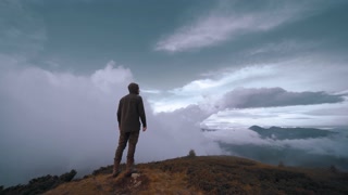 The man standing on a mountain on the cloud background. slow motion