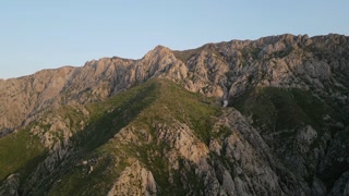 Aerial view of sunlit Chimgan ridge in the Ugam-Chatkal mountains, Uzbekistan. Golden hour reveals rocky crest, alpine meadow and seasonal