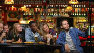 At the Bar or Restaurant, Person Takes Selfie with Friends. Group of Young People in Stylish Setting.