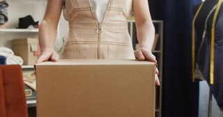 Woman dressmaker putting new jumpers into delivery box and closing close-up. Fashion designer sending ready-made clothes to client, sewing trend things to order. Seamstress working in workshop.