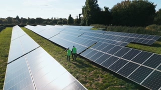 Drone Shot Of Engineers Inspecting Solar Panels In Field Generating Renewable Energy