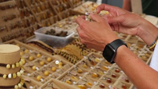 Jewelery showcase on street market. Woman choosing decorations on local street market in Gdansk, Poland. Female tourist is choosing
