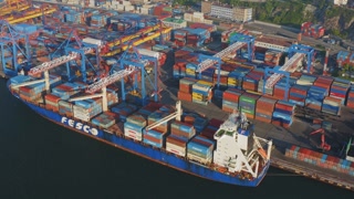 Aerial view of cargo containers being unloaded by a gantry crane from a container ship onto road transport. Global Supply Chain. International shipping - CIRCA 2022 Vladivostok, Russia