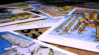 The tarot card reader lays out the cards with pictures up.