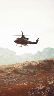slow motion Vietnam War era helicopter in mountains