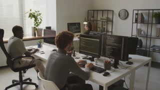 Back view of multiethnic programmers team of three writing program codes on desktop computers while working together in contemporary minimalist open space office
