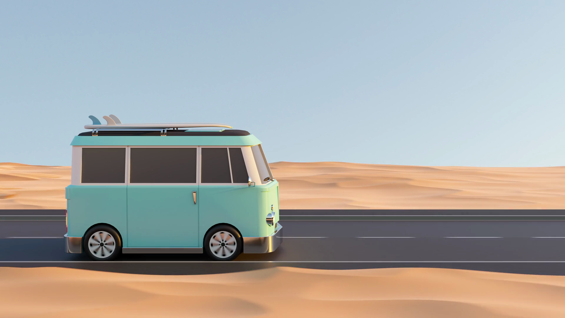 3d Animation Loop Of Vintage Blue Van Driving On Asphalt Road Near Sandy Dunes On Sunny Day