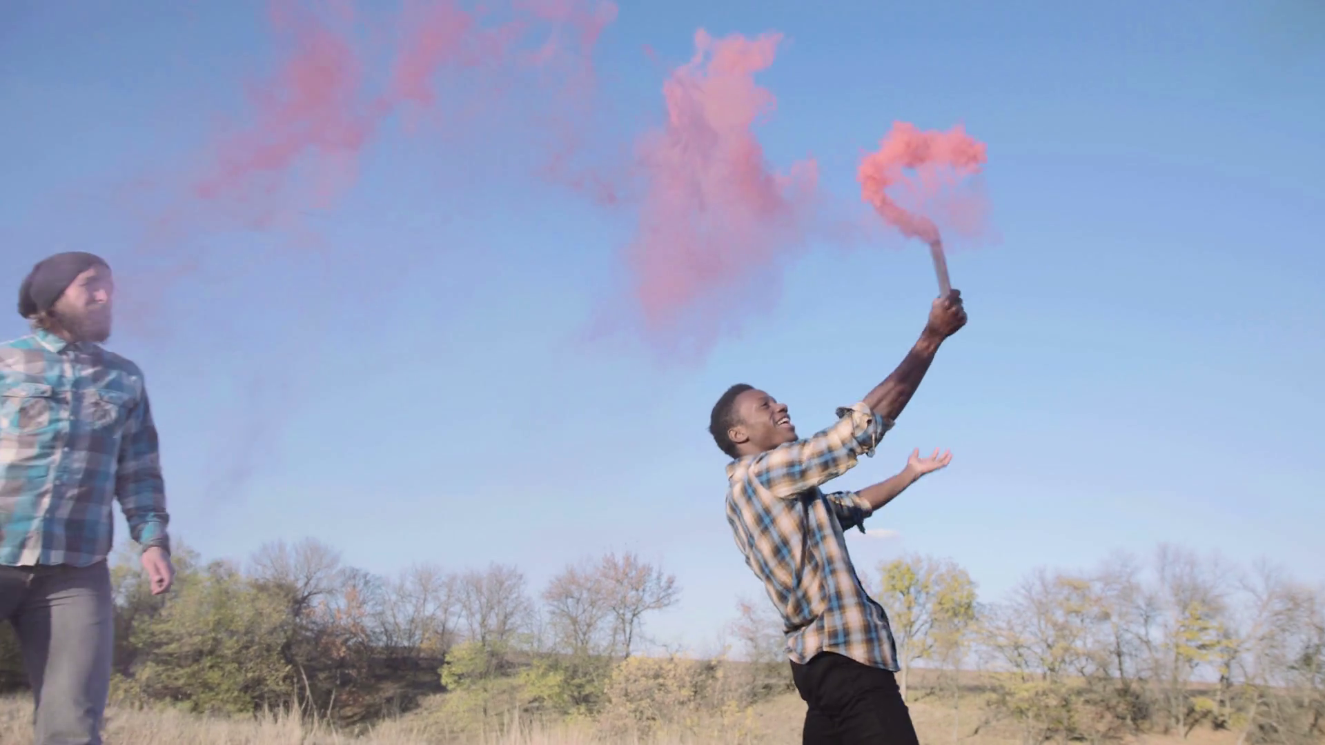 Four Friends Dancing Joyfully In A Field With Colorful Smoke GrenadesÂ