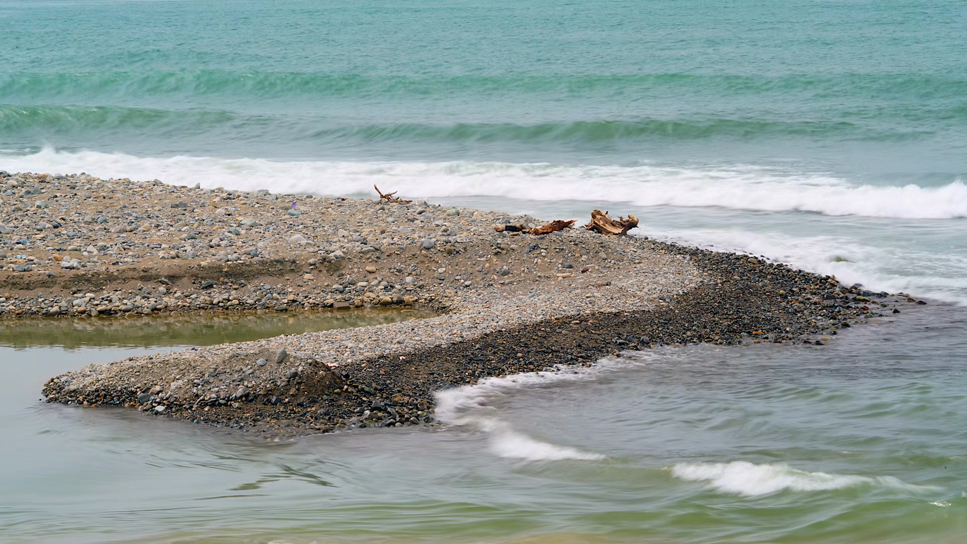8k Timelapse Of Sand Spit Promontory At Estuary Meeting Sea With Breaking Waves Coastal Headland Formed By Natural Sediment Bars Arcs Into Surf Tidal Lagoon Sculpting ShorelineÂ