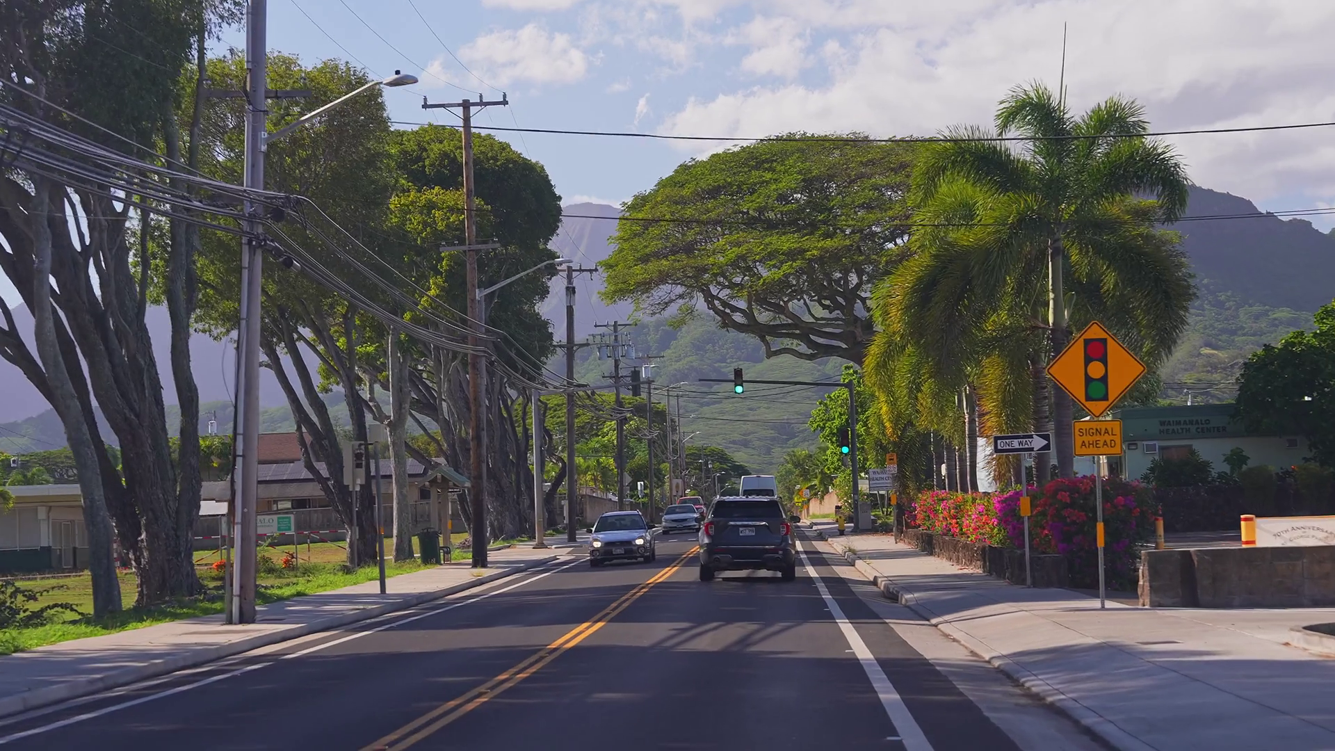 A Continuous Drive Through A Suburban Area In Hawaii With Lush Greenery Vibrant Flowers Towering Mountains And Vehicles On A Two Lane RoadÂ
